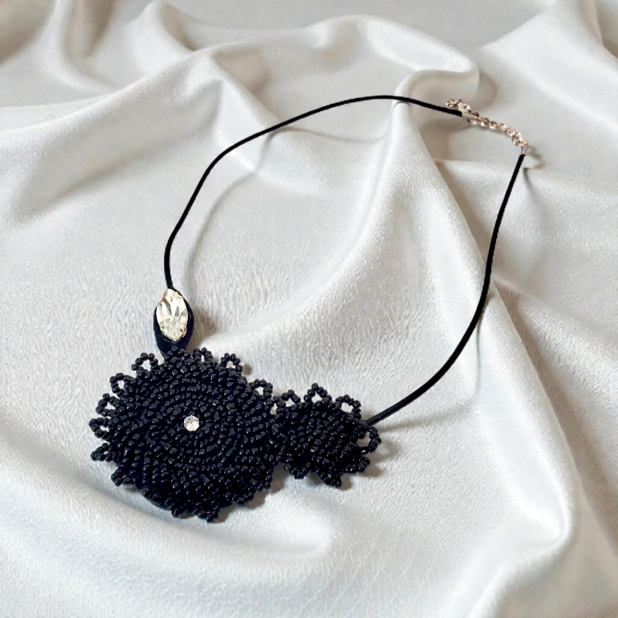 Colier la baza decolteului, potrivit atat pentru o tinuta office cat si pentru tinute elegante. Este confectionat din margelute toho negre cusute pe forme rotunde, alaturi de 2 cristale mici argintii transparente. Colierul este creat pe snur din piele acologica neagra. Sistem de inchidere metalic cu lant ce poate ajusta lungimea.