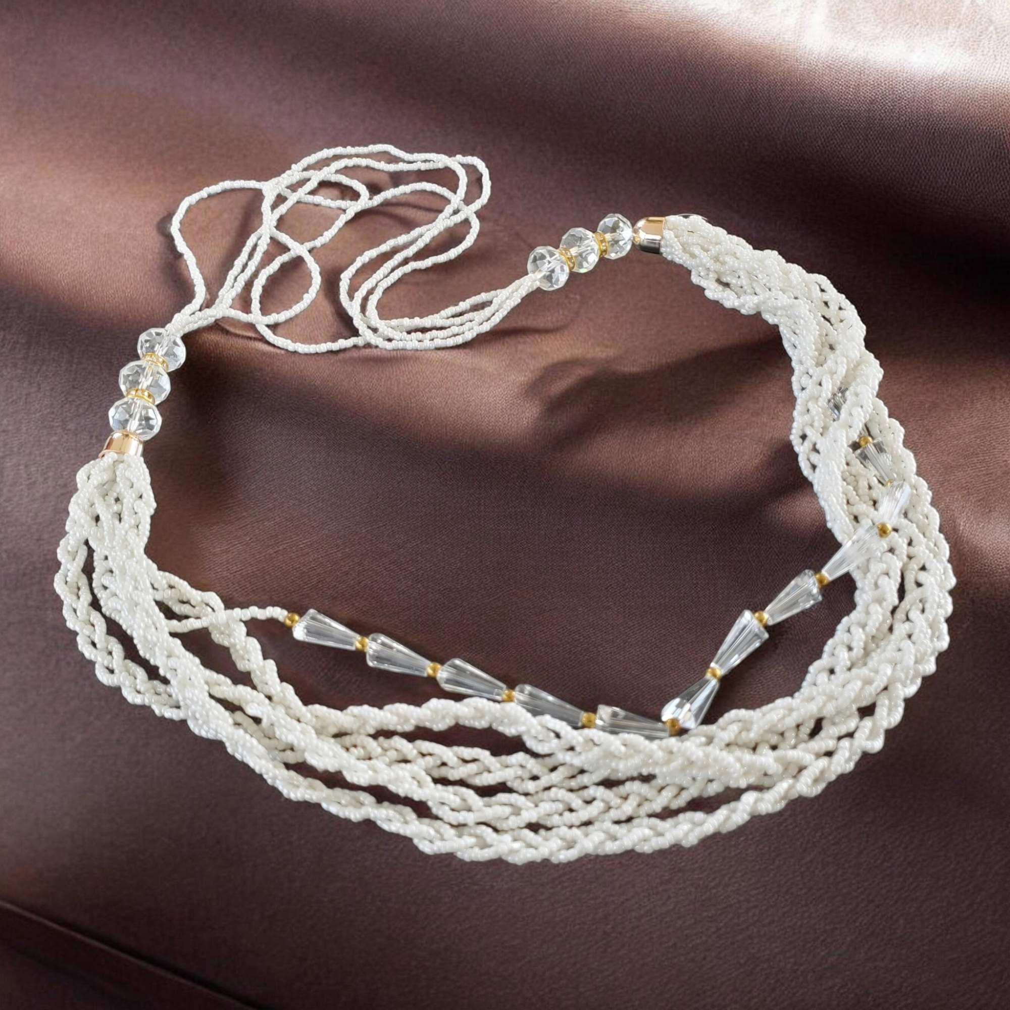 Colierul este compus din patru siraguri de margelute japoneze toho impletite, albe. Un alt sirag este din cristale de sticla crem transparente.