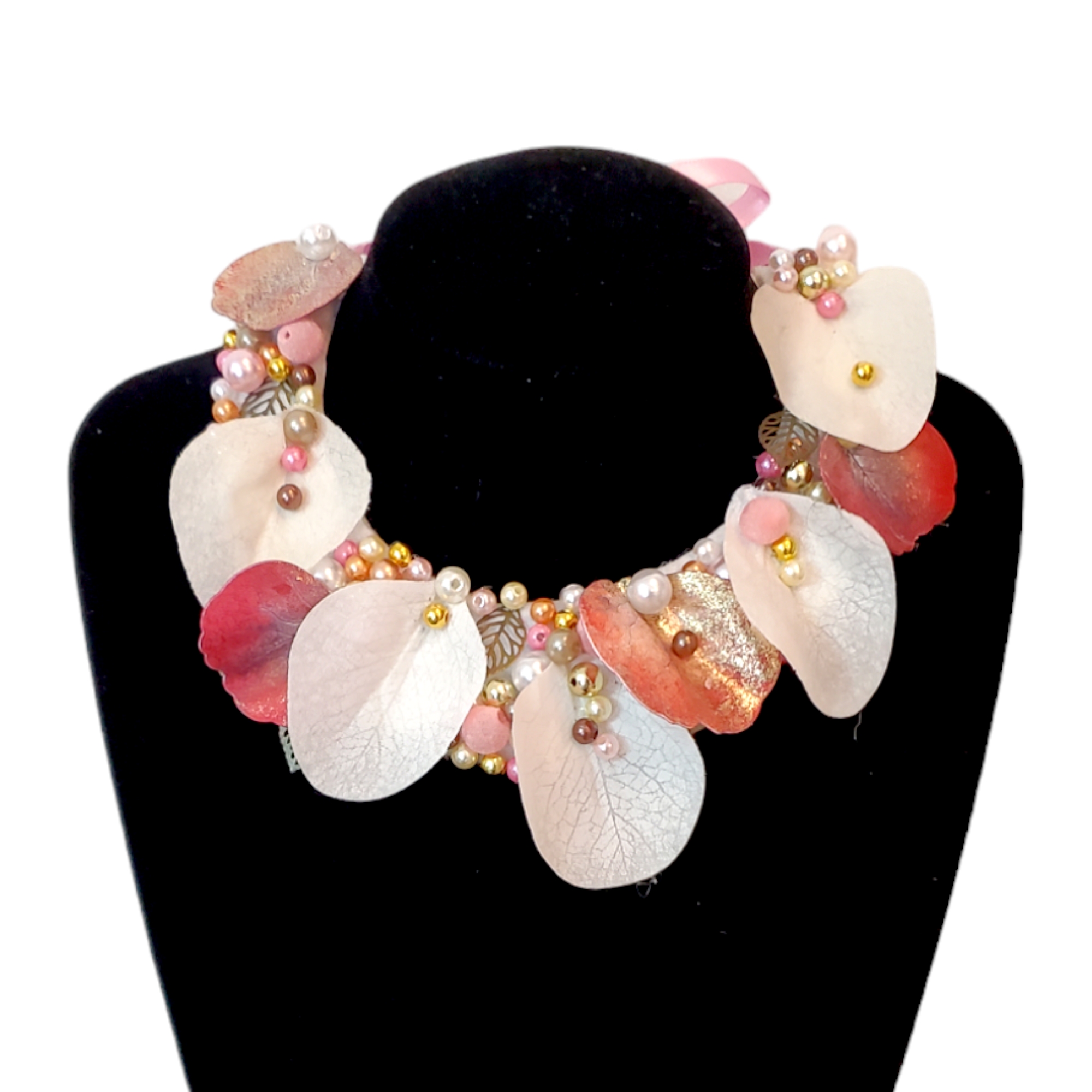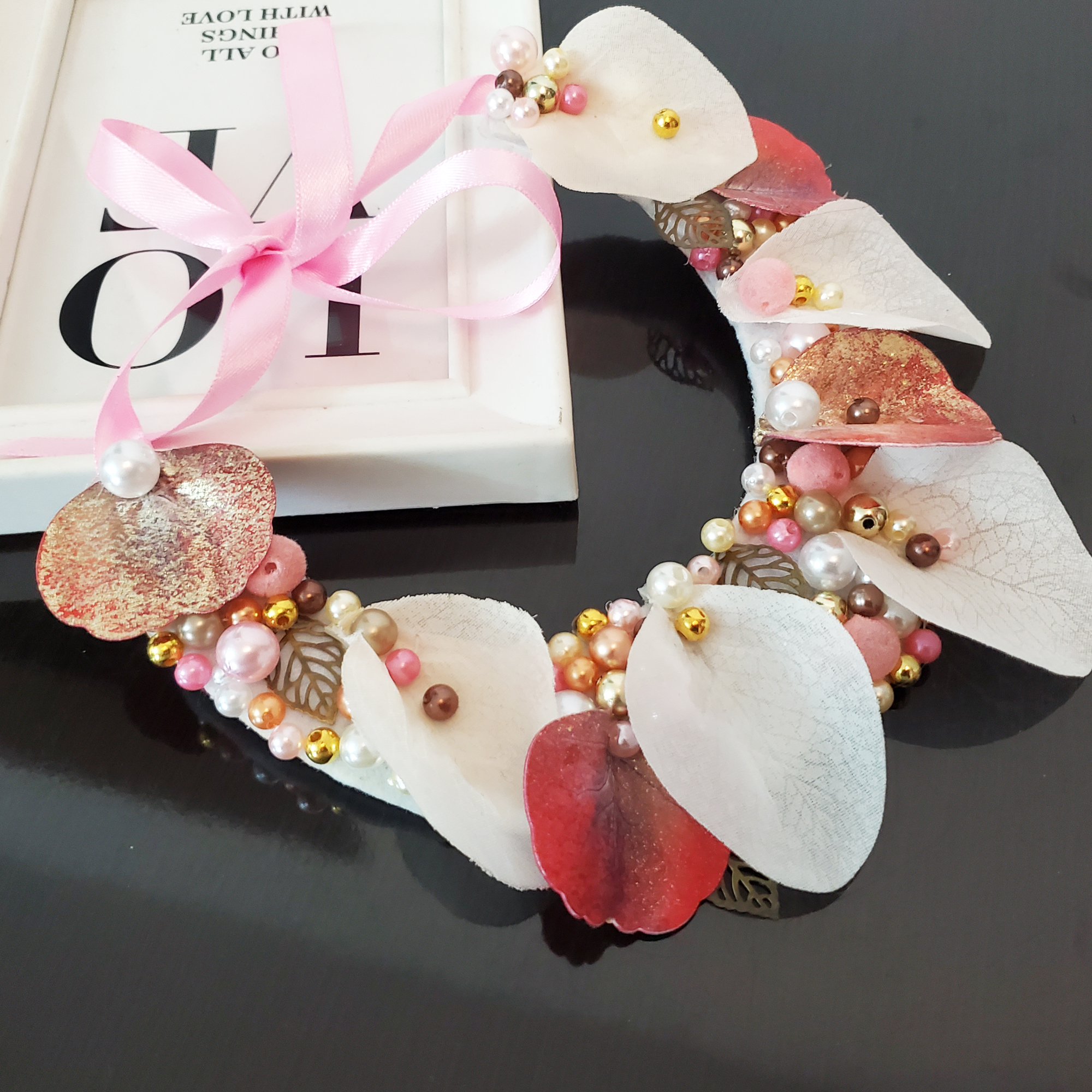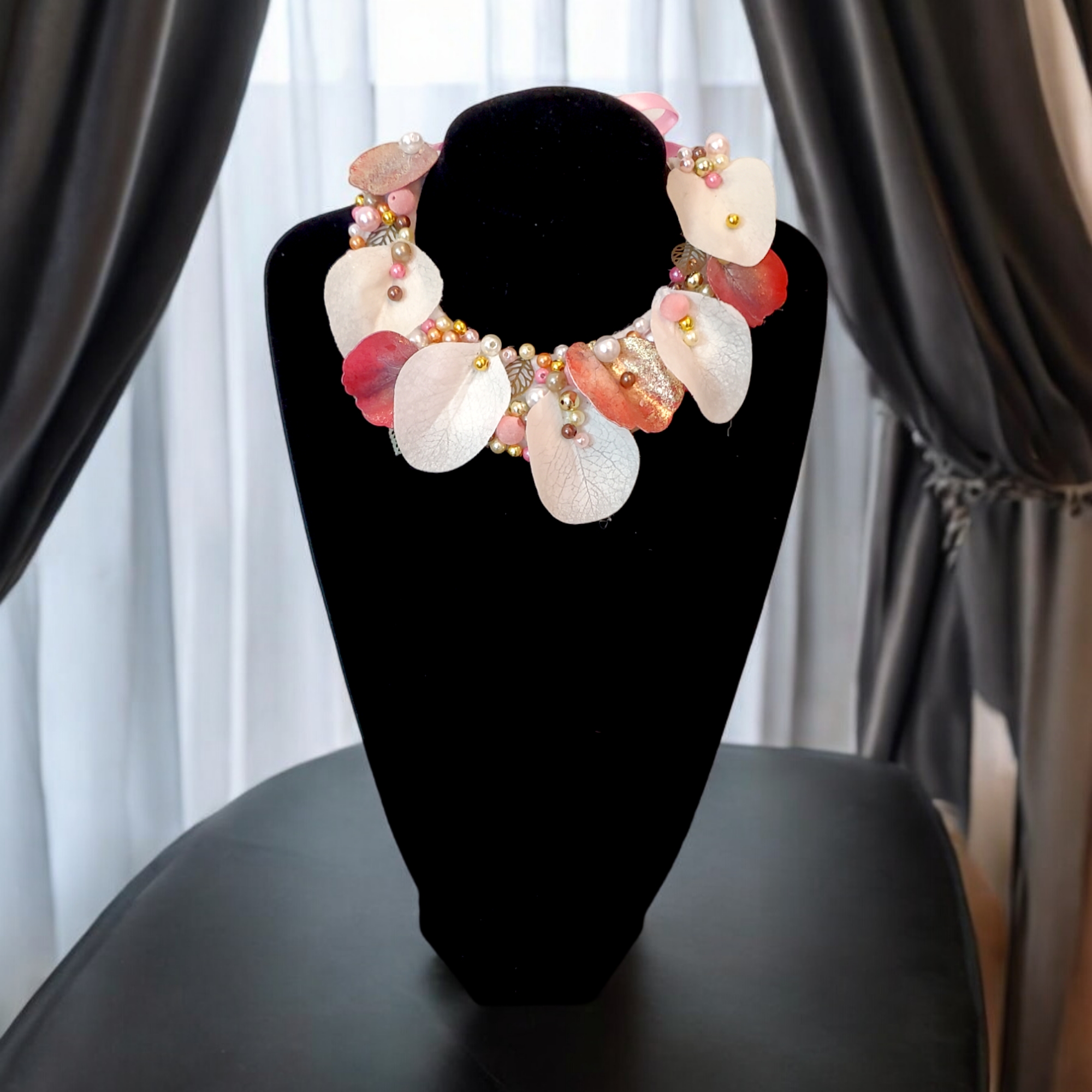 Descoperă Colierul Sakura, un statement handmade ce împletește armonios frunze brodate în alb, roz pal și auriu, presărate cu perle și detalii fine. Inspirat de frumusețea toamnei, fiecare element este cusut manual, pentru ca tu să porți o poveste unică la fiecare apariție.
