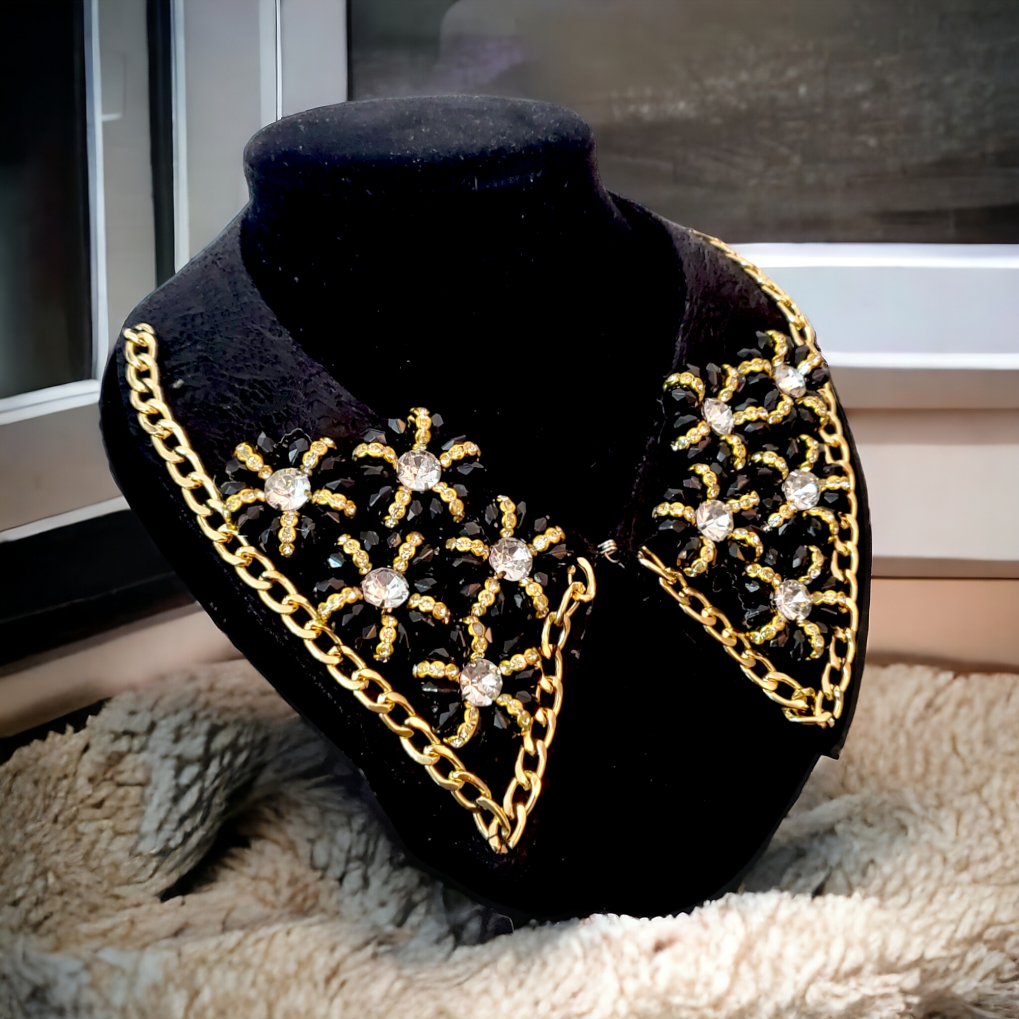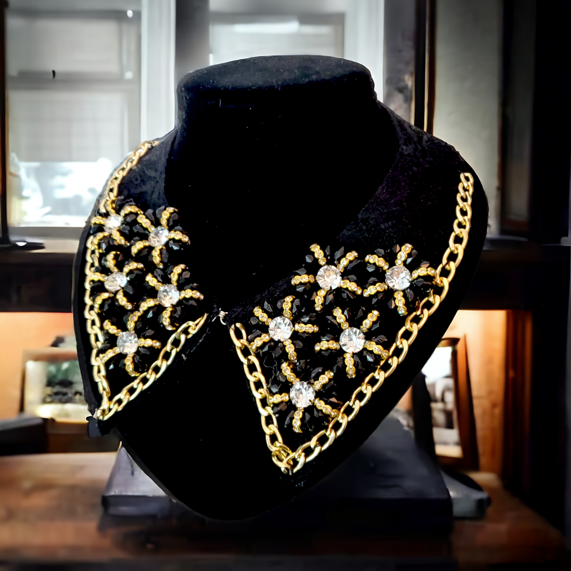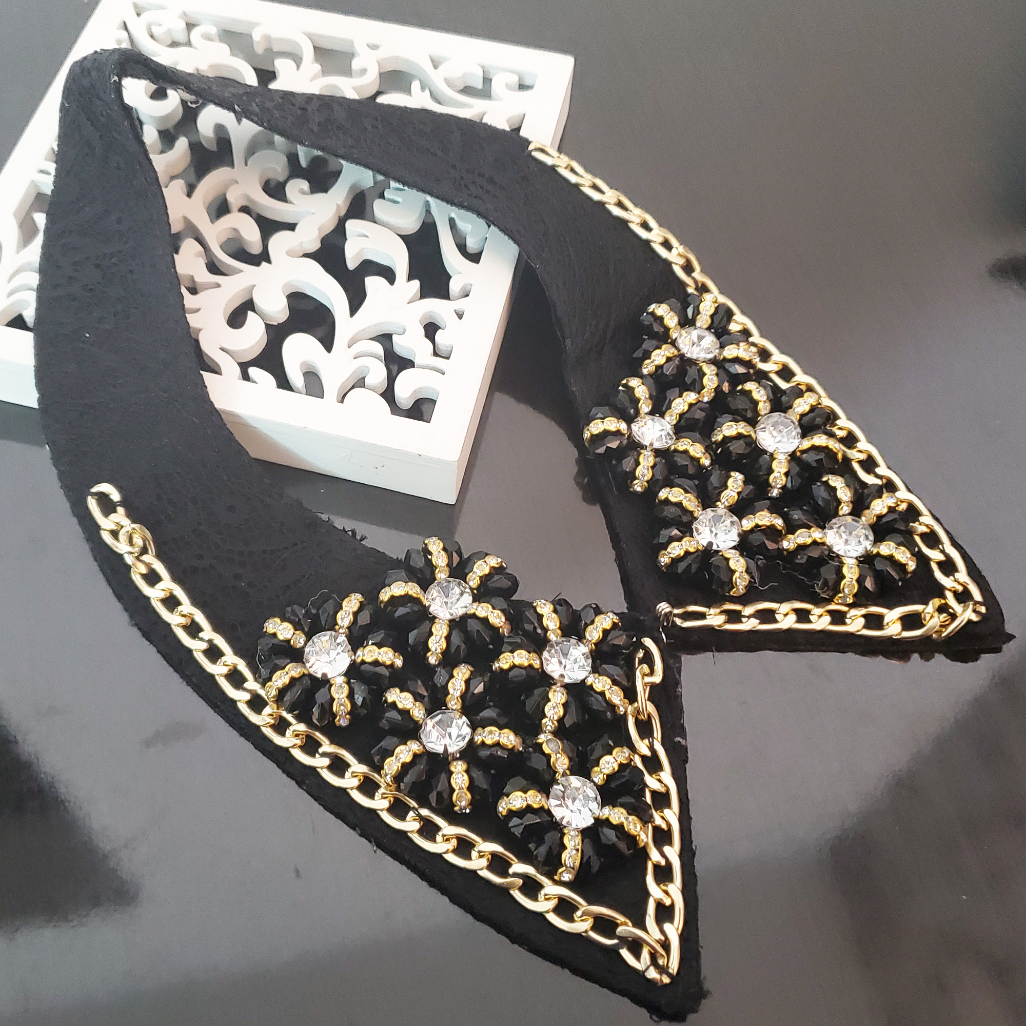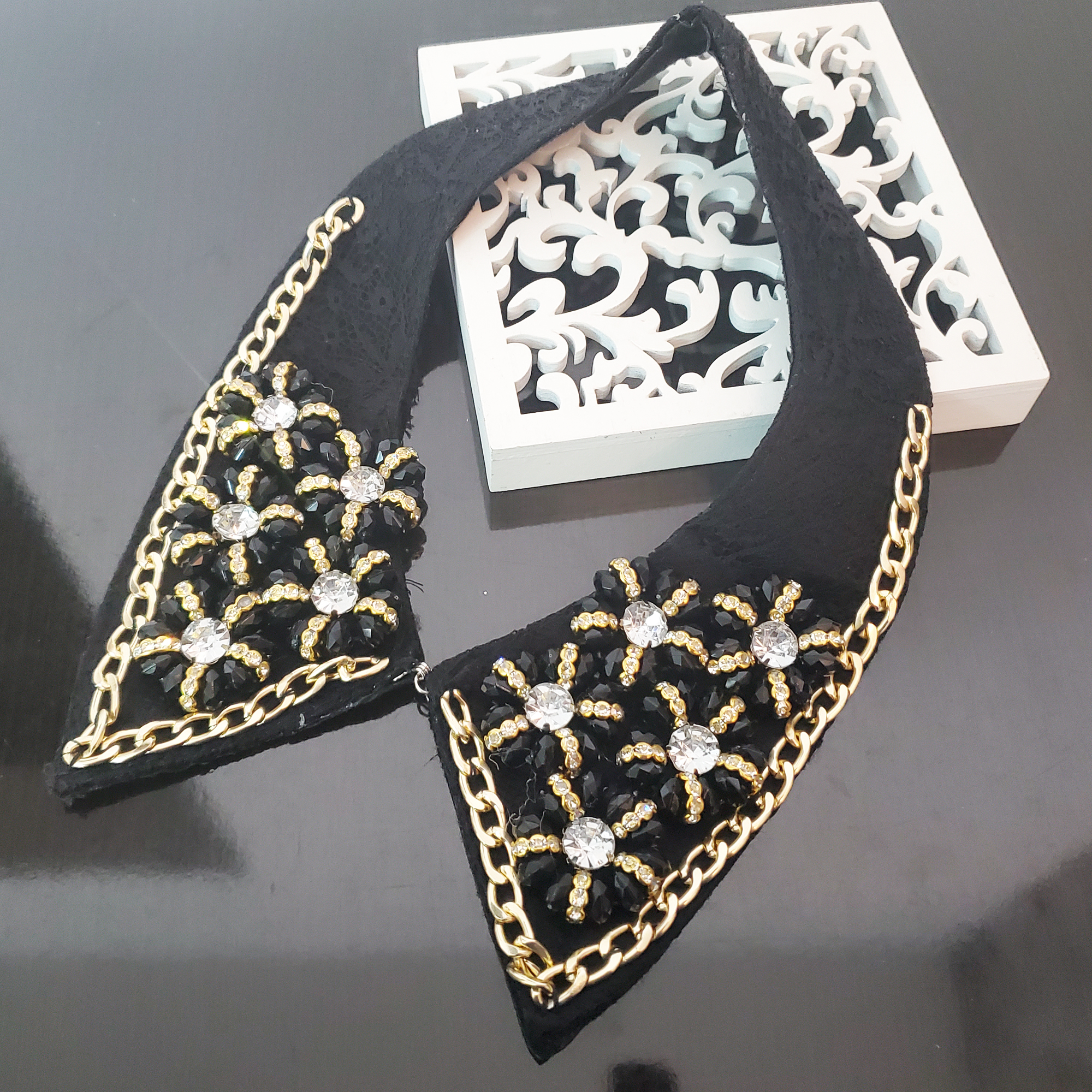 Guler detasabil cu inchidere in fata, cu perle si strasuri. Gulerul se poate purta atat la bluze cat si la rochite decoltate, pentru un efect vizual statement.