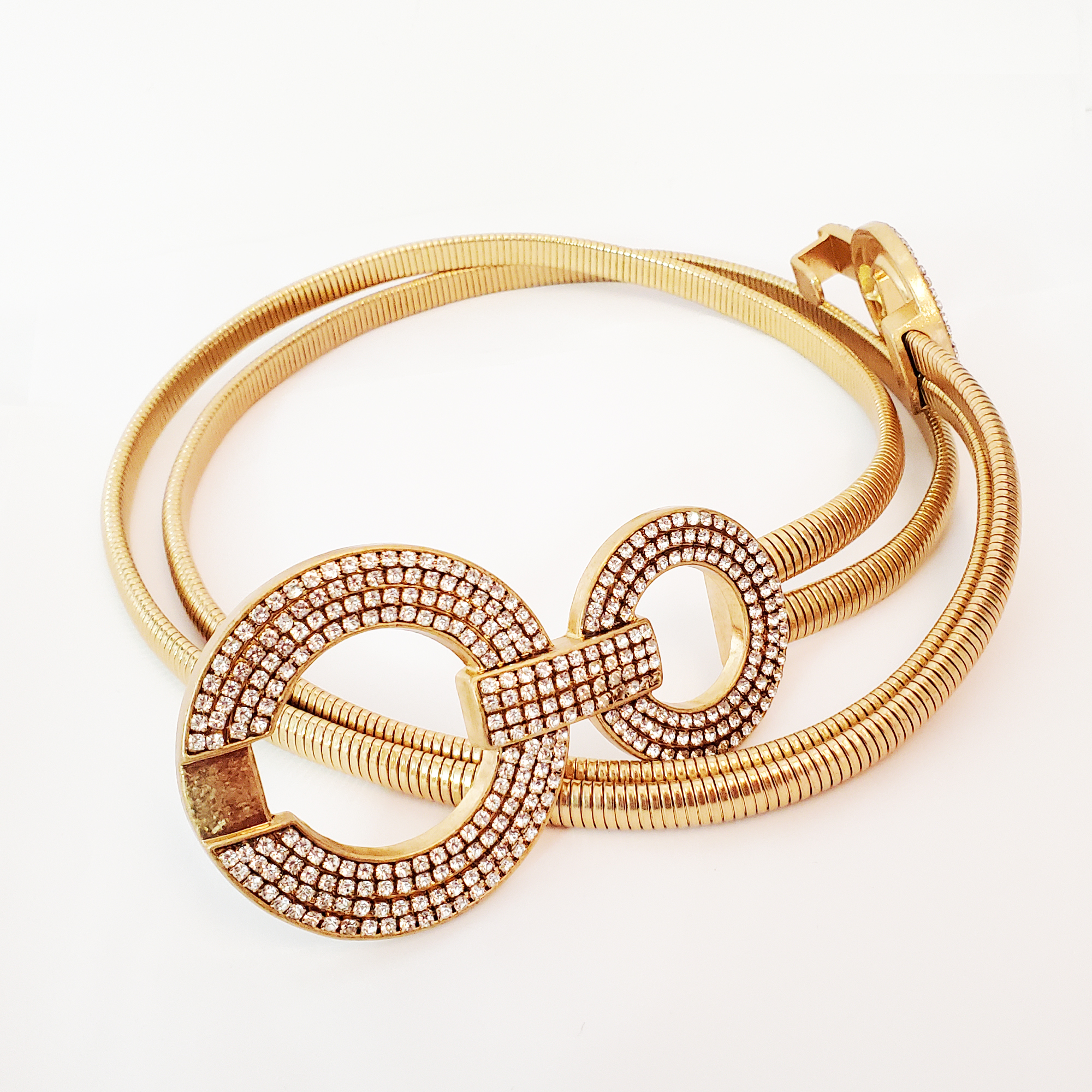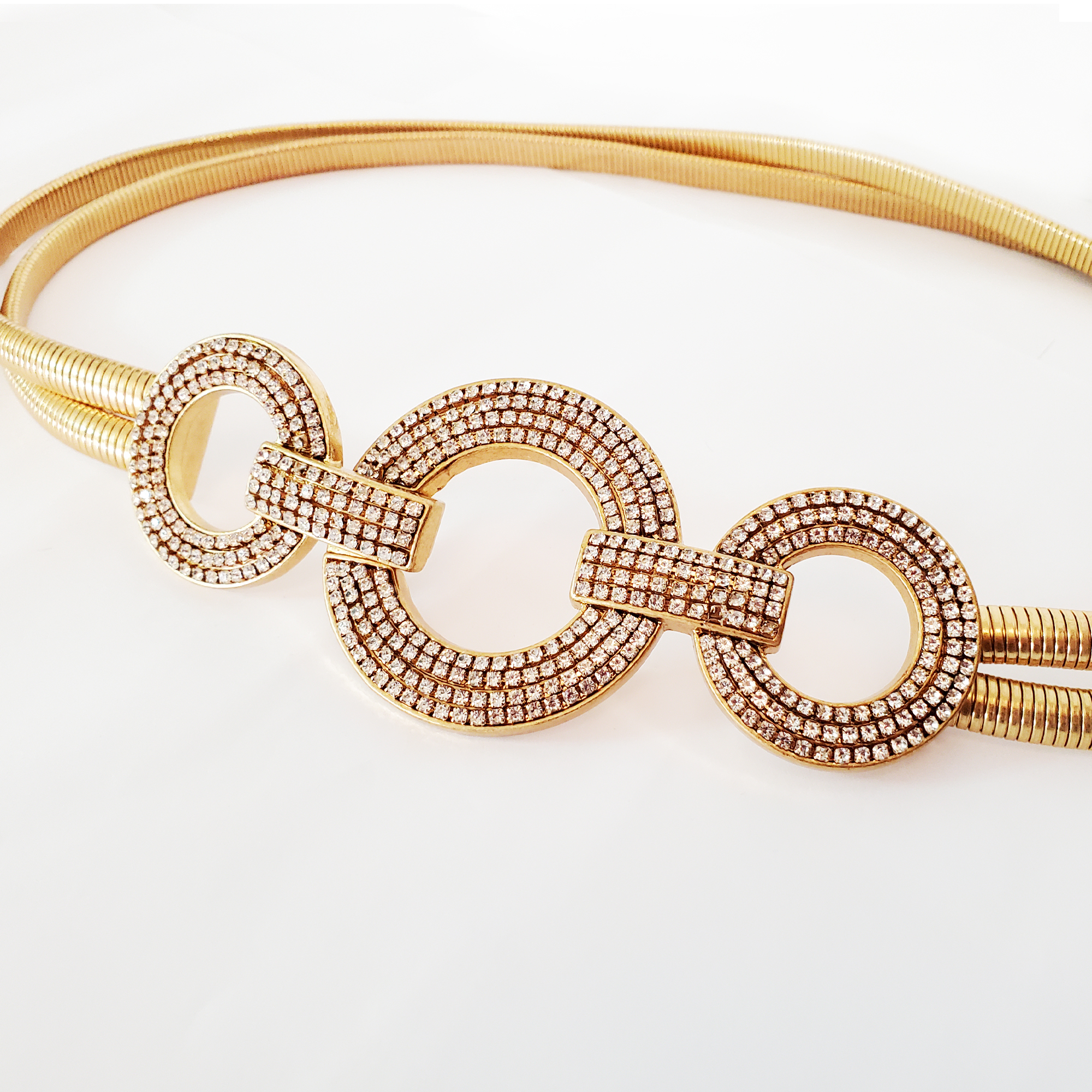 Cureaua este confectionata din doua parti metalice modelatoare, elastice. Catarama este metalica aurie cu strasuri albe batute. Se inchide in fata cu ajutorul cataramei elegante.