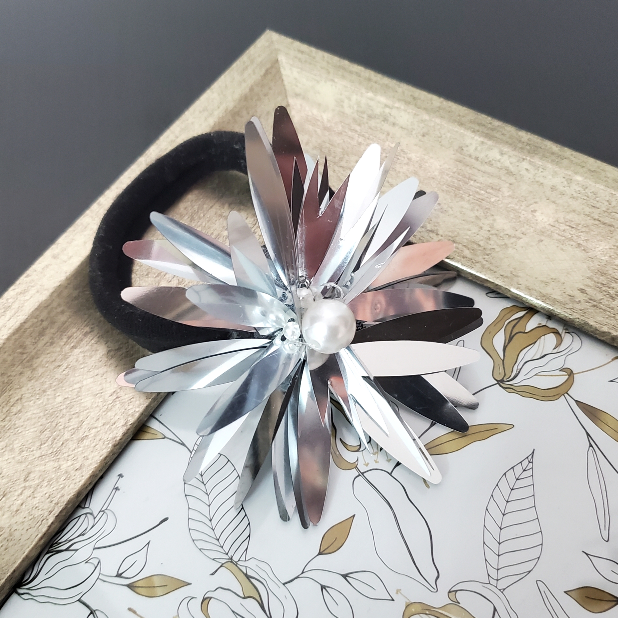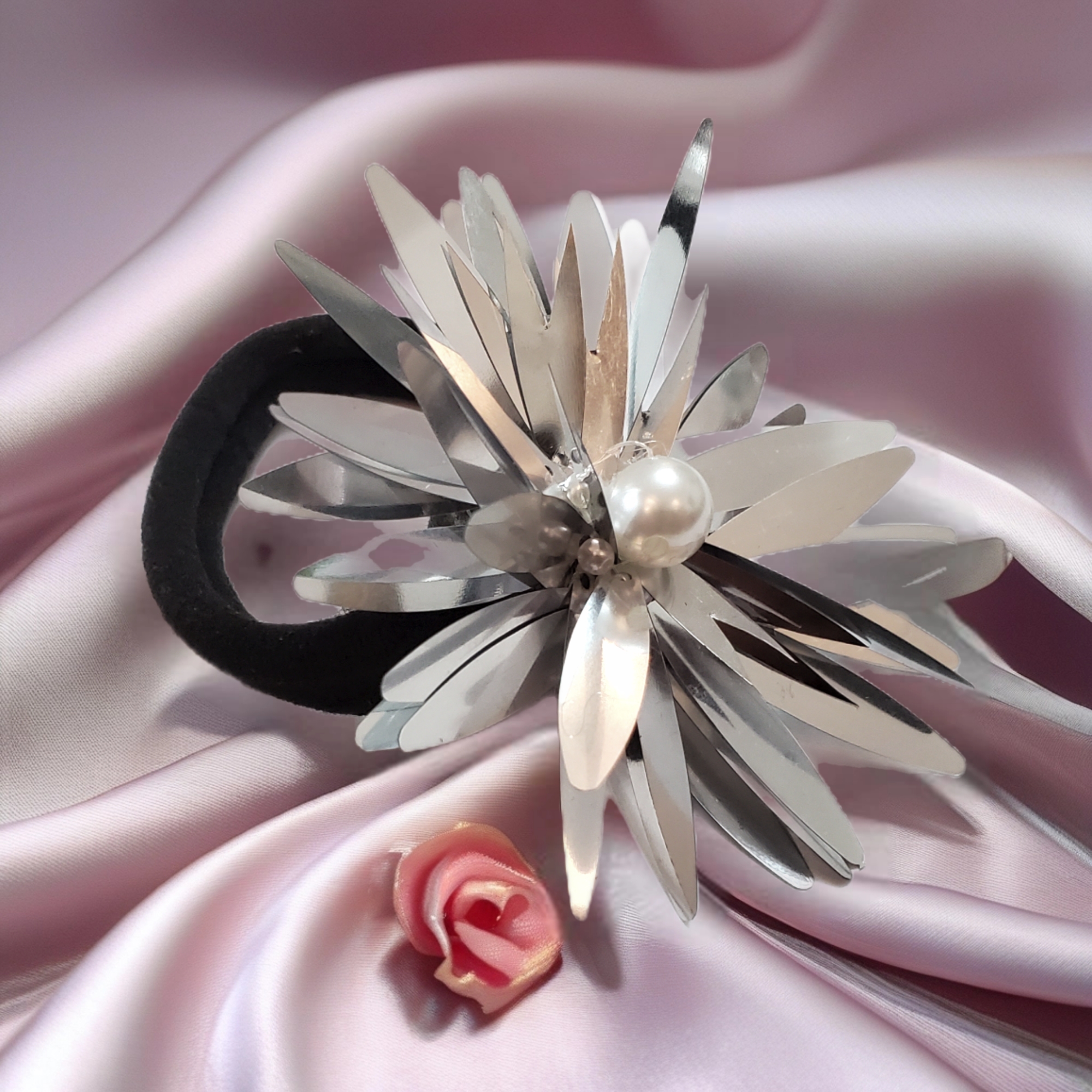 Elastic de par cu aplicatie din paiete, pe buretel negru moale.