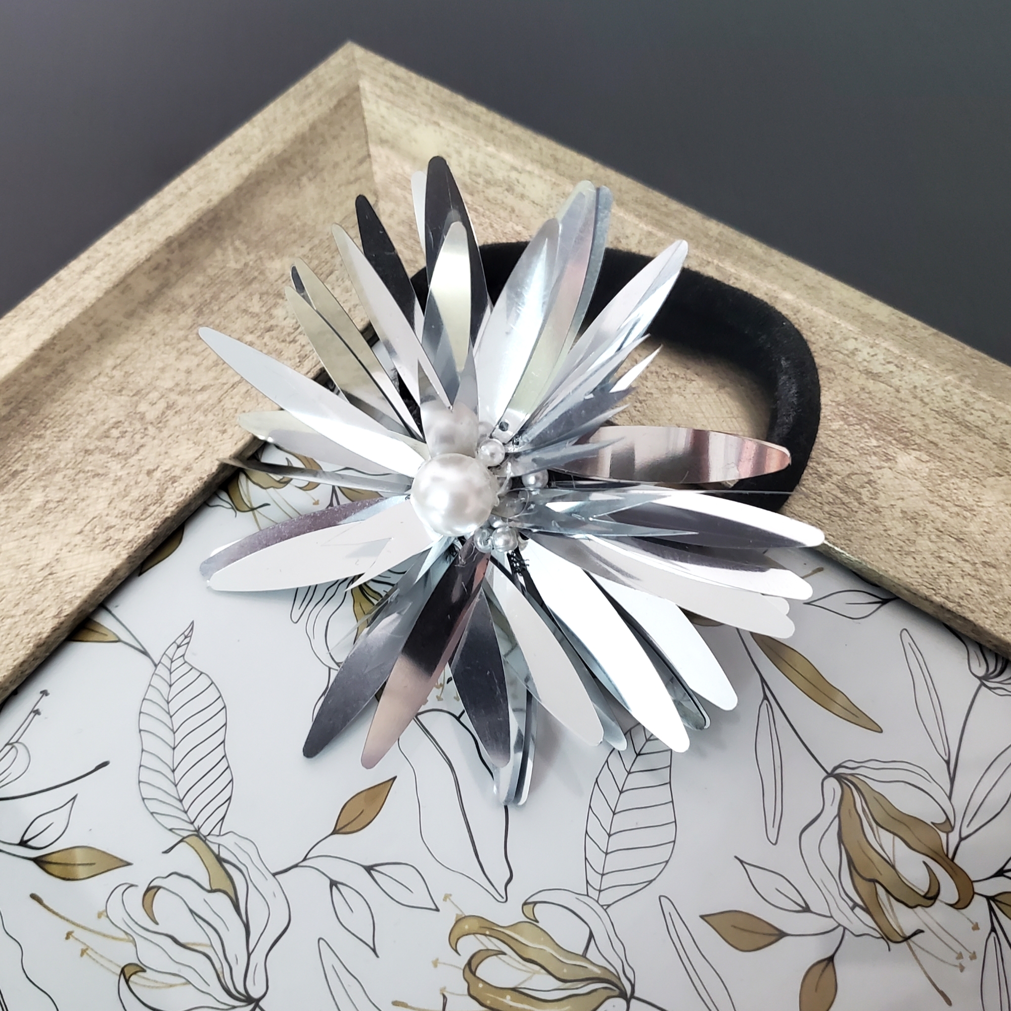 Pe buretel este cusuta o aplicatie din paiete argintii in forma de floare, un accesoriu elegant si totodata comod.