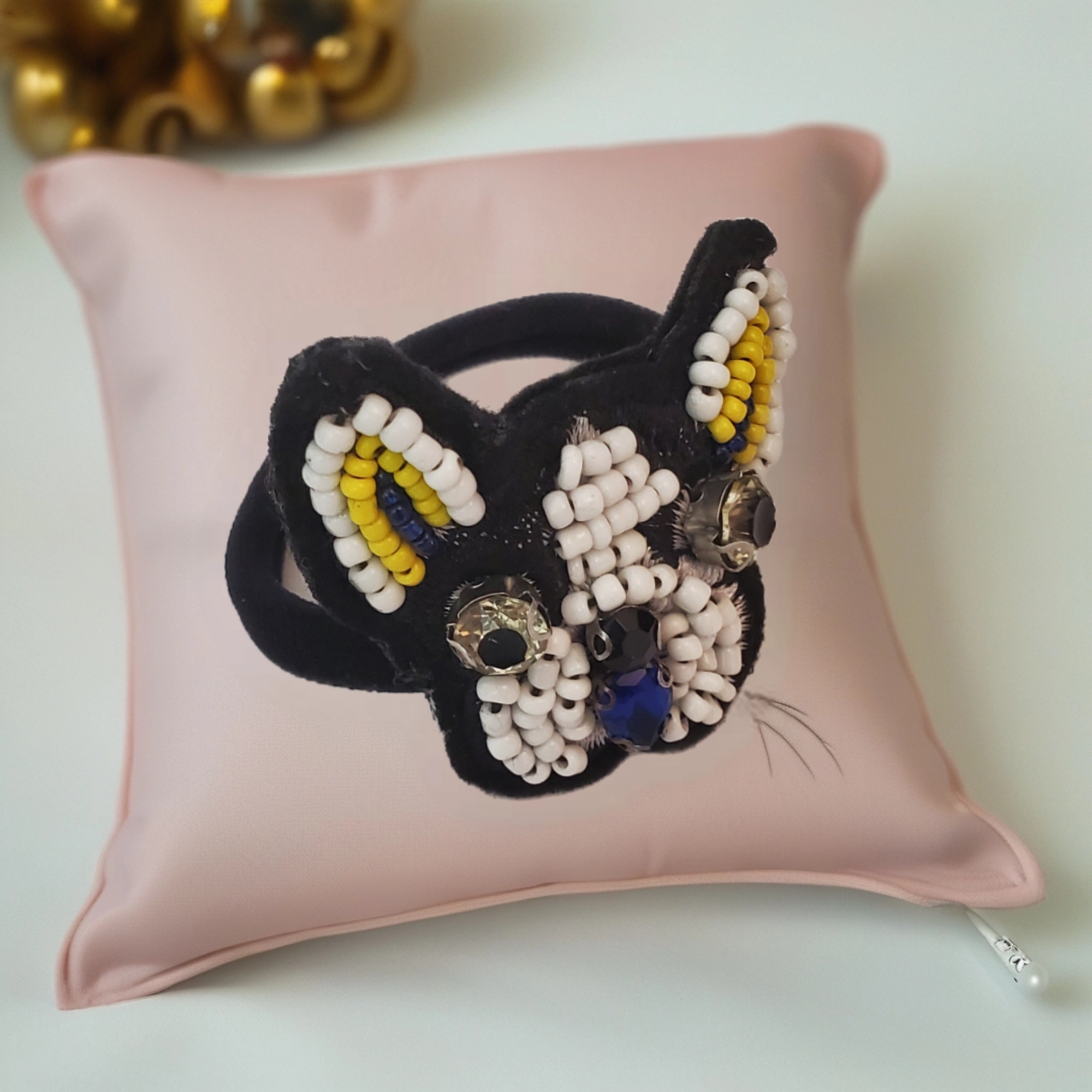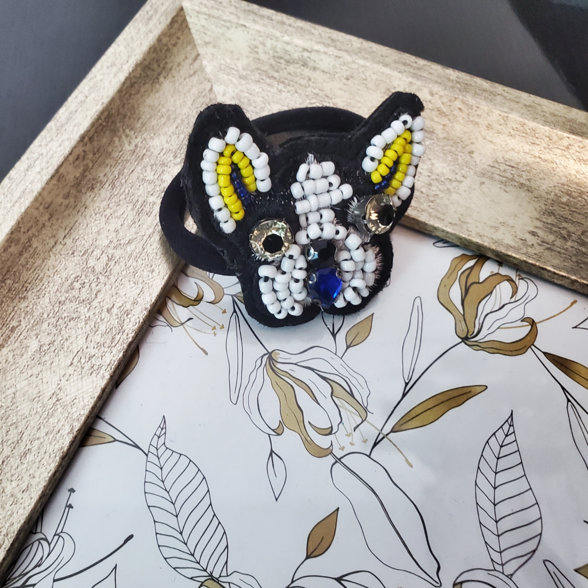 Elastic de par moale negru, cu aplicatie in forma de catelus french buldog, cu margelute toho si cristale de sticla. Margelute sunt in nuante de alb, galben si albastru, pentru a contura frumos profilul catelusului.