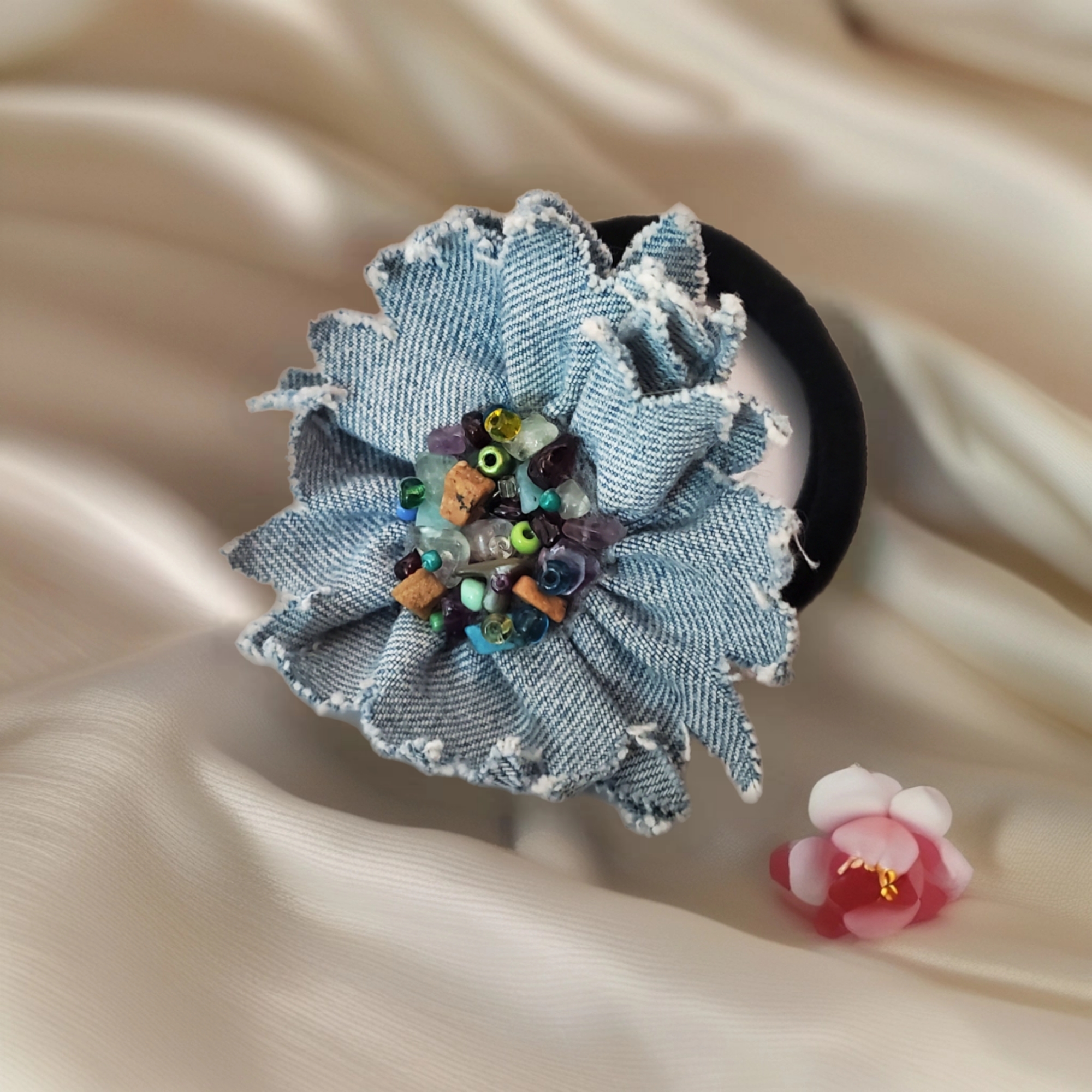 Elastic de par cu o floare din blugi realizata manual, cu pietre naturale cusute.