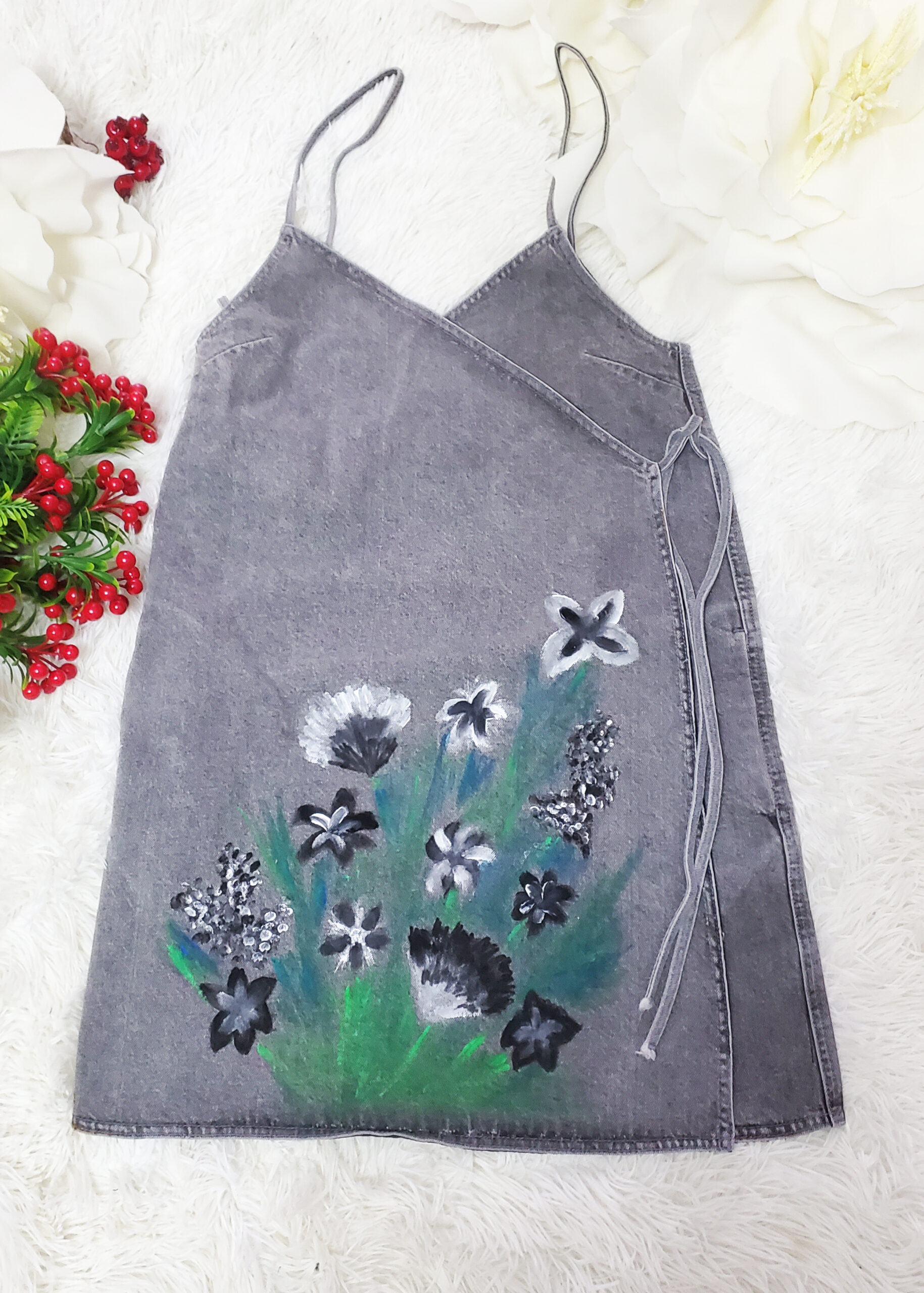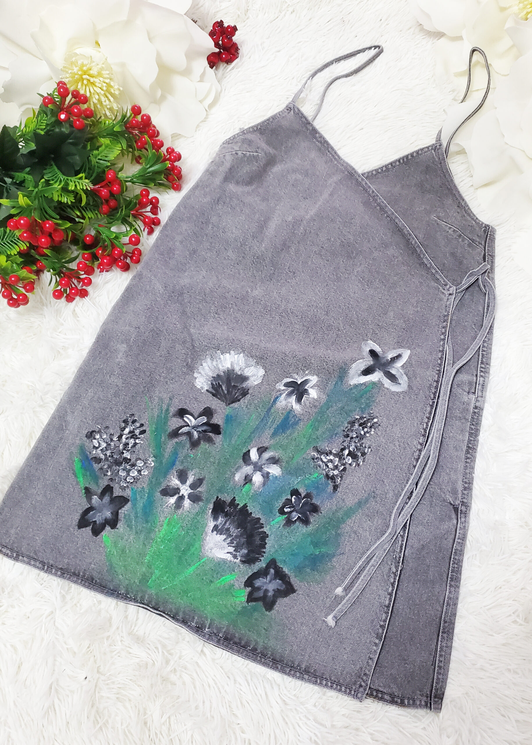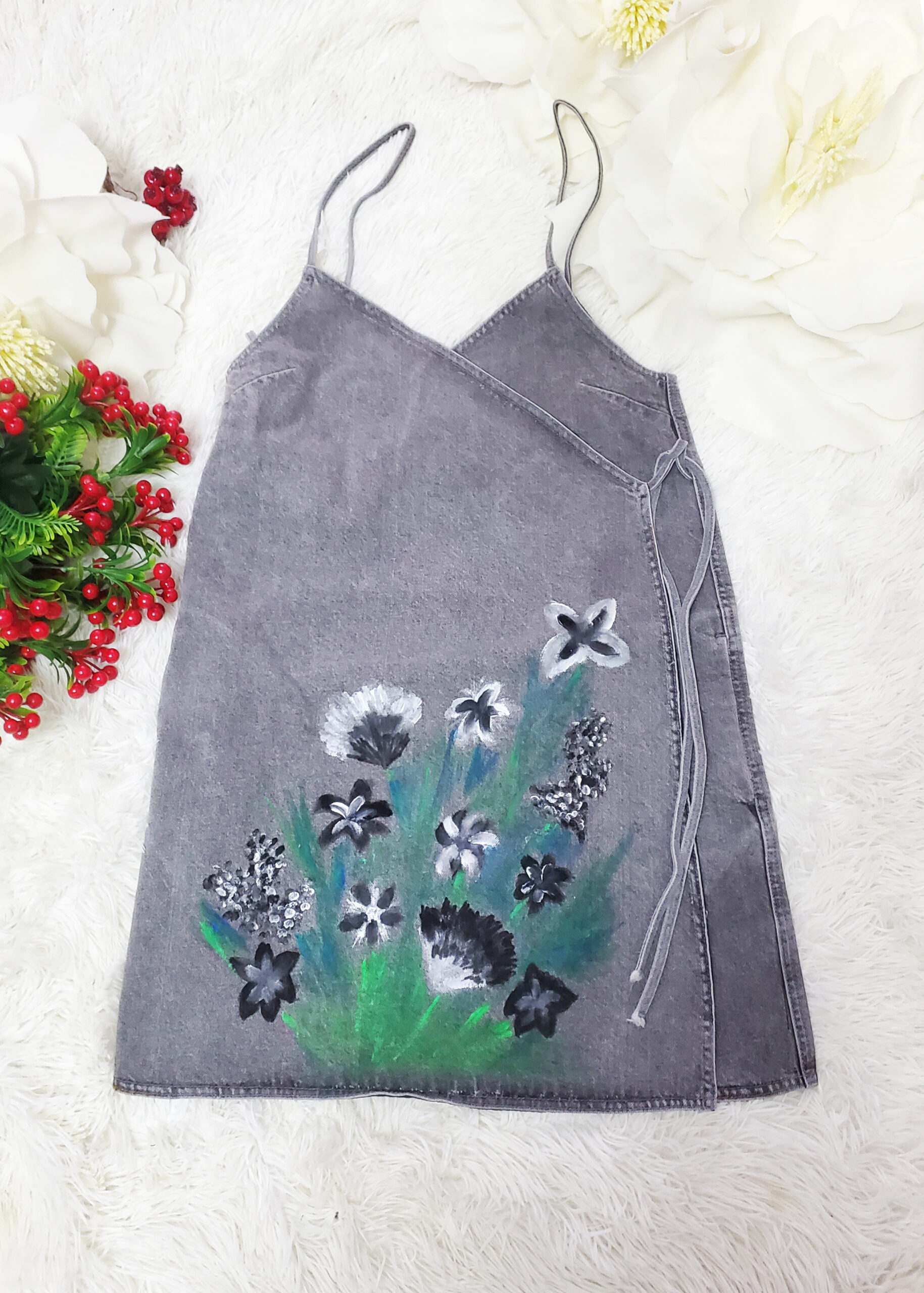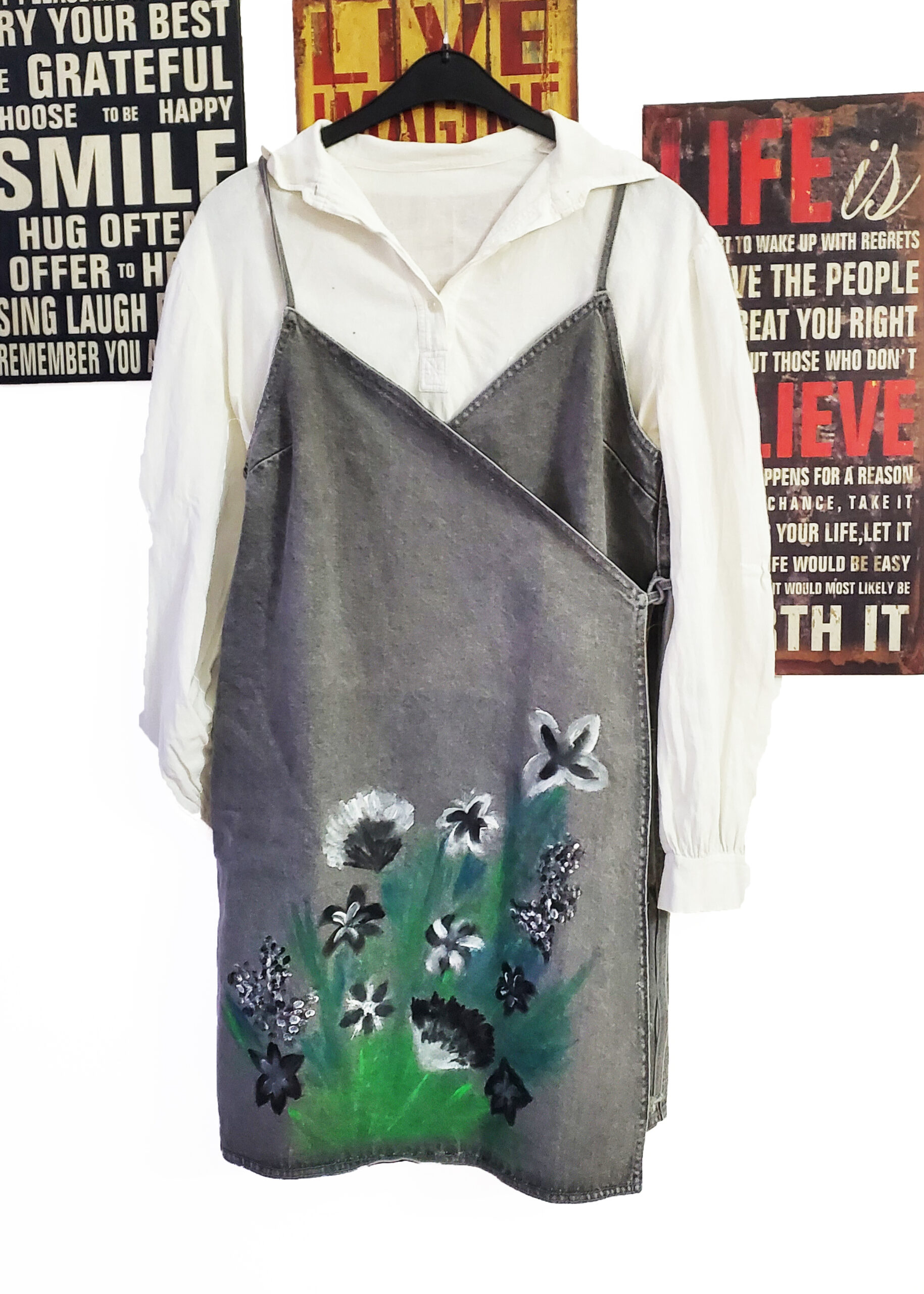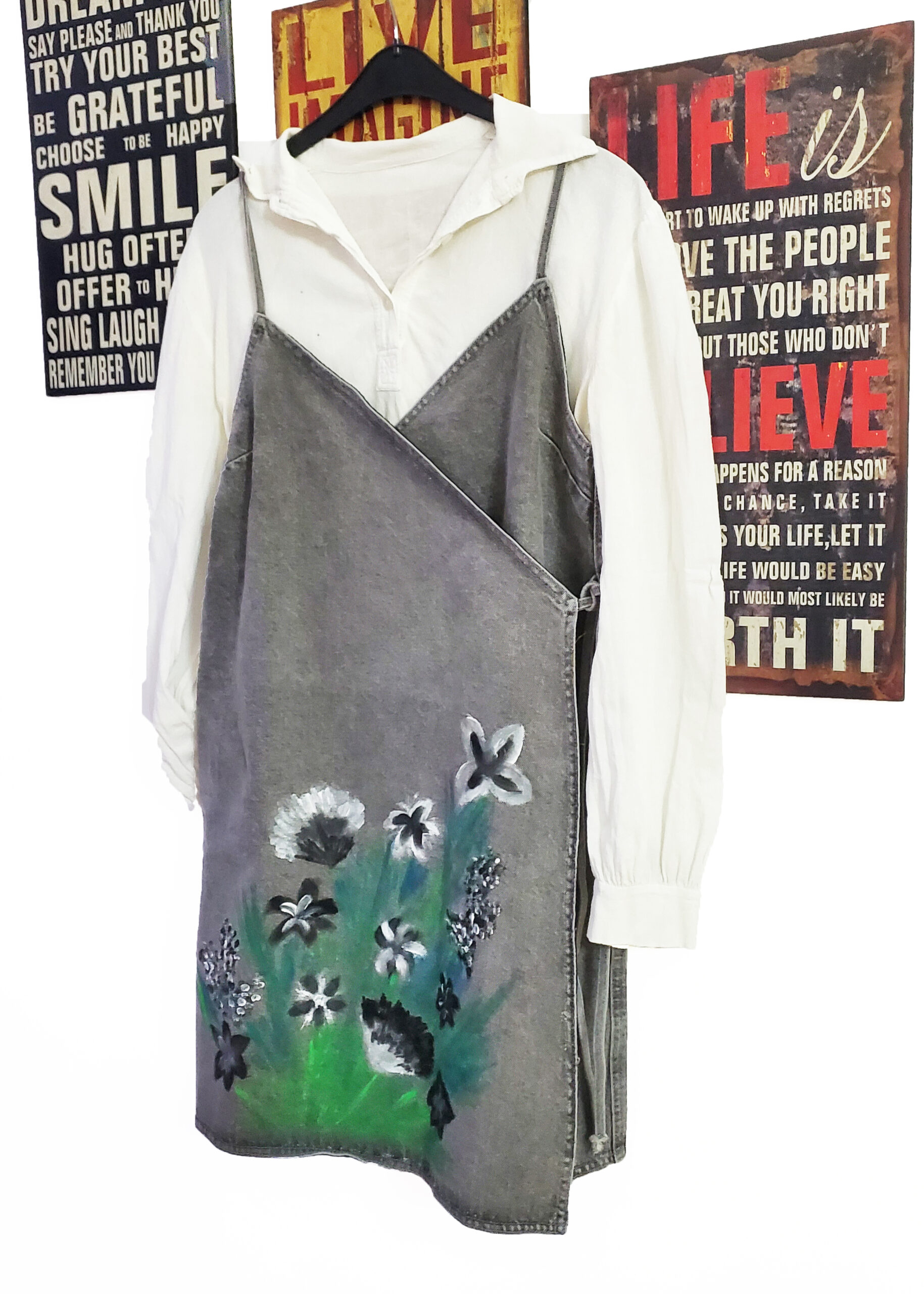 Rochie de blugi stil tunica, material cu densitate inalta, culoarea gri. Rochita are bretele si 2 buzunare. Se petrece in 2 parti prin 4 snururi din acelasi material cu rochita. Lungimea este pana la nivelul genunchilor. Este o piesa foarte versatila, putand fi purtata ca atare sau in combinatie cu camasa, bluza, colanti. Este putin oversize.