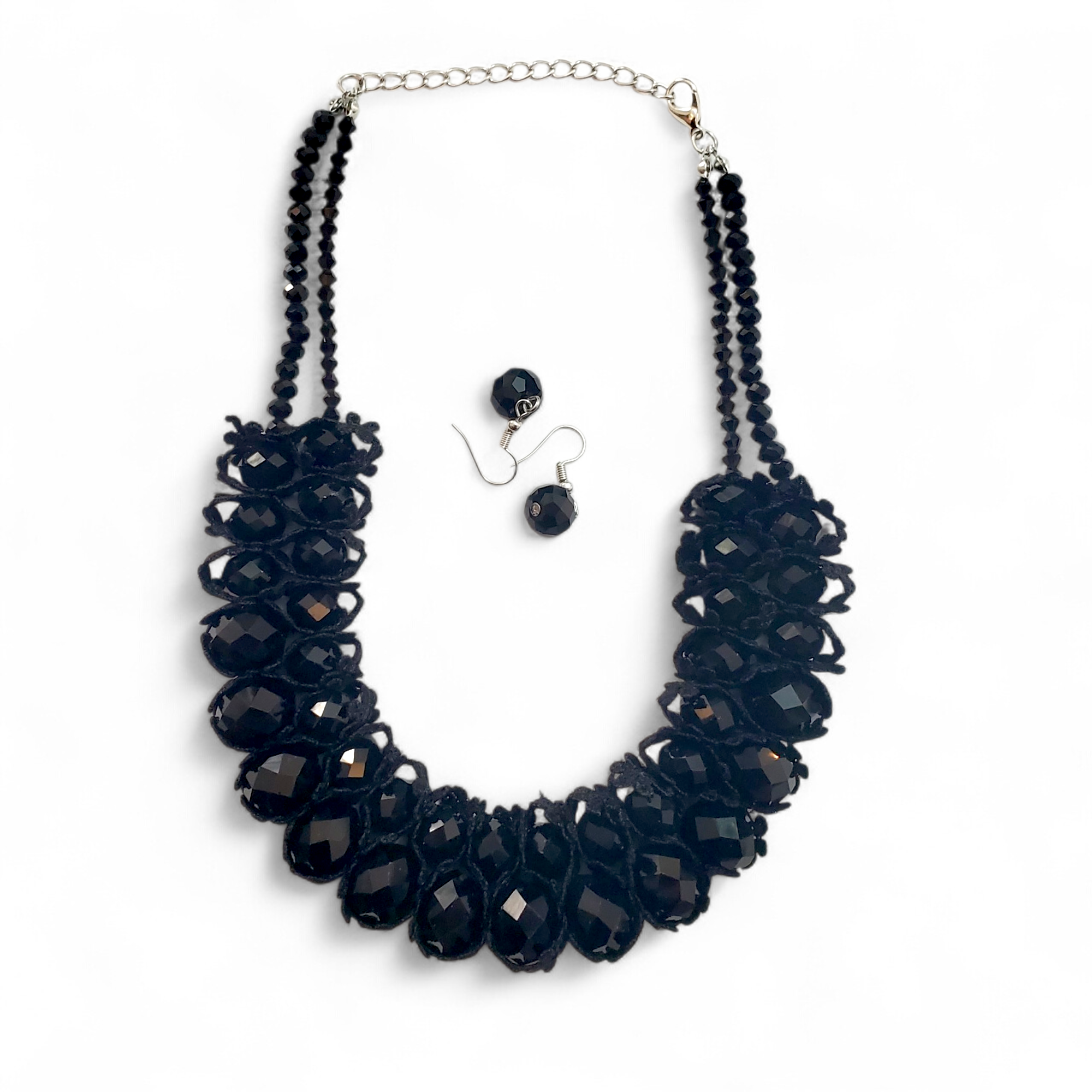 Set elegant de bijuterii ce contine un colier si o pereche de cercei. Bijuteriile sunt elegante, pentru iubitoarele culorii negru.