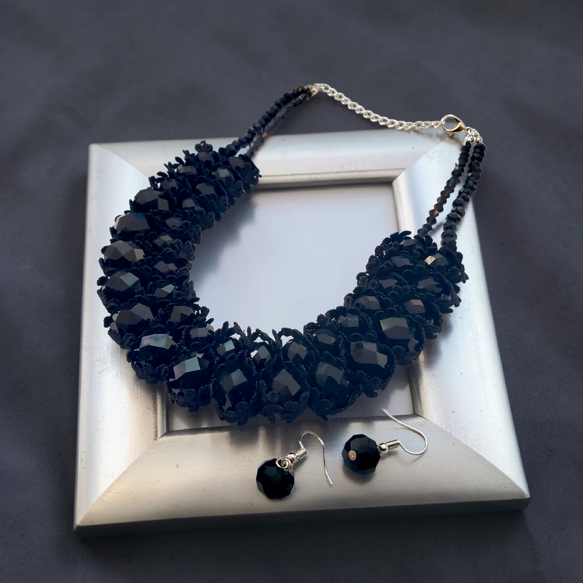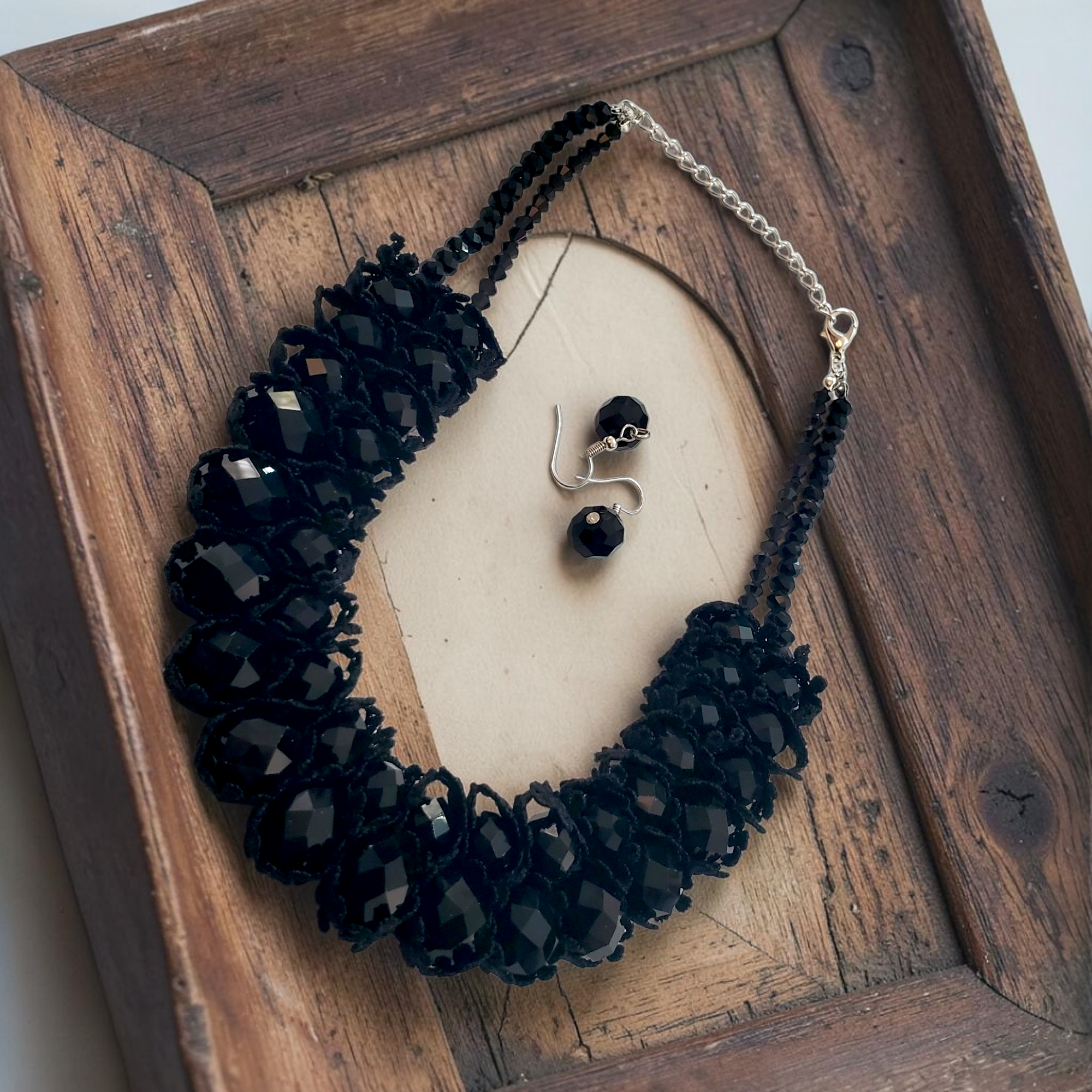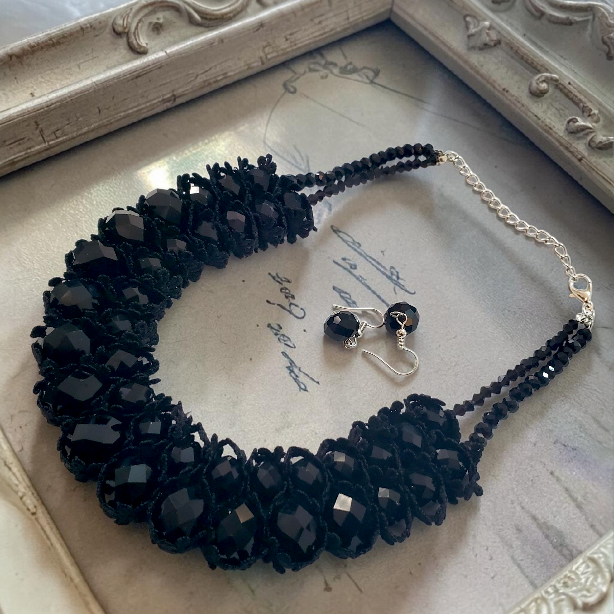 Colierul este la baza gatului, cu posibilitatea de a fi ajustat pana la nivelul decolteuilui. Atata colierul cat si cerceii sunt din cristale de sticla negre. Toate cristalele sunt imbracate si distantate printr-o dantela fina de bumbac neagra Cerceii sunt simplii, cu un cristal de sticla, tip carlig.
