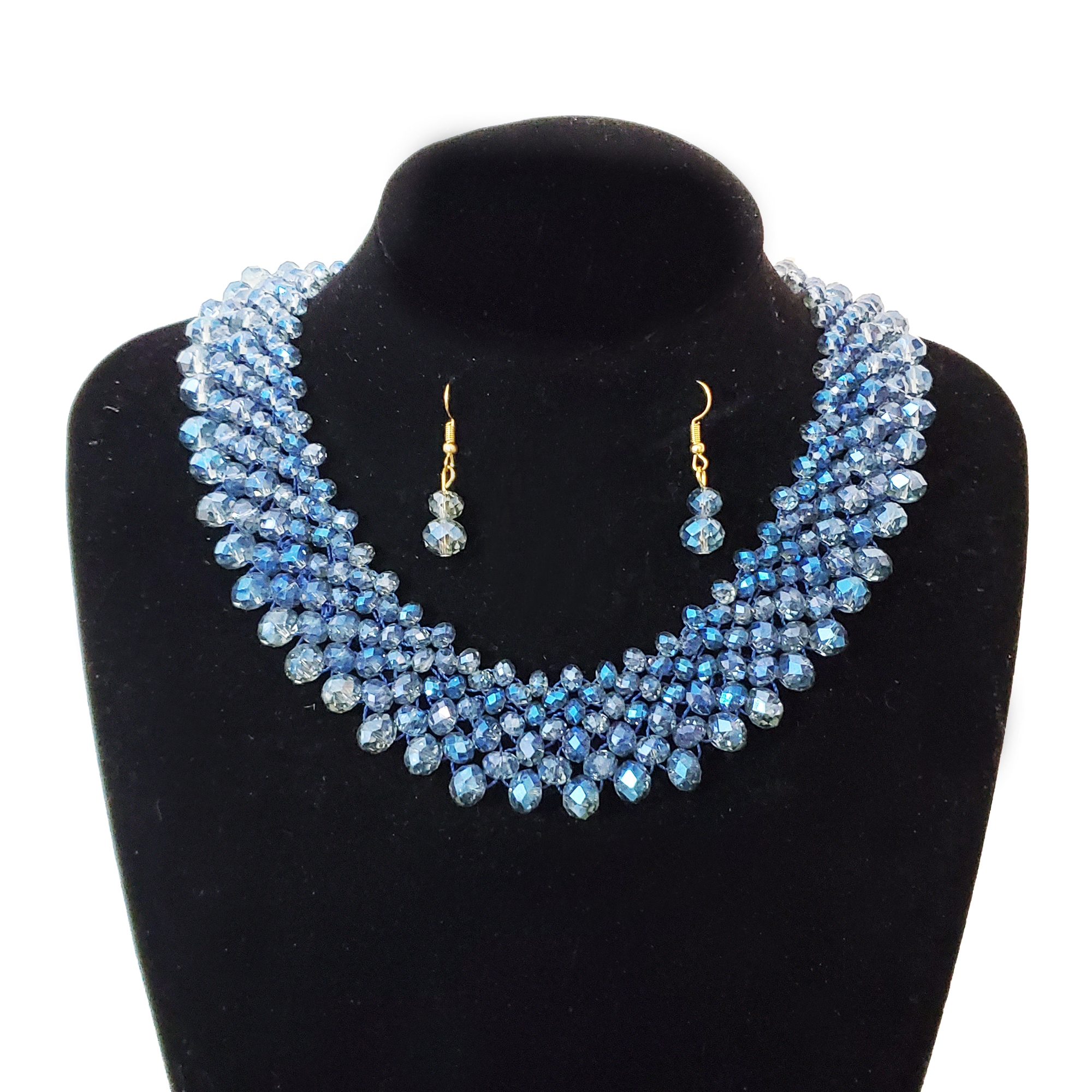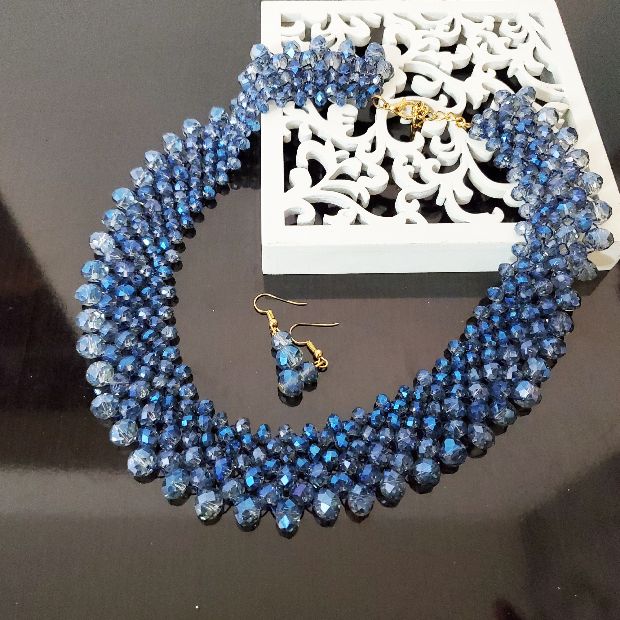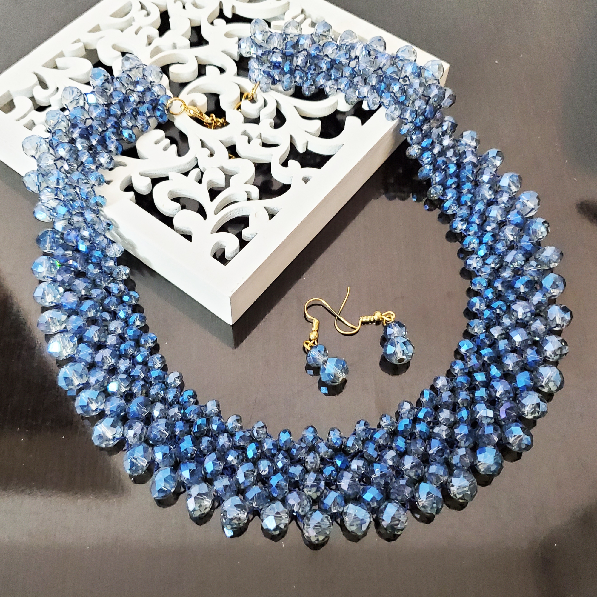 Setul contine un colier si o pereche de cercei. Ambele sunt realizate doar din cristale fatetate de dimeniuni mici, intr-o nuanta de albastru cu reflexii. Colierul este pe model rotund, la baza gatului, cu cinci siruri. Se inchide la spate cu cheita metalica reglabila pentru lungime. Cerceii sunt de tip carlig. Produs de serie, diaponil in mai multe culori. Se livreaza in sac textil pentru bijuterii.